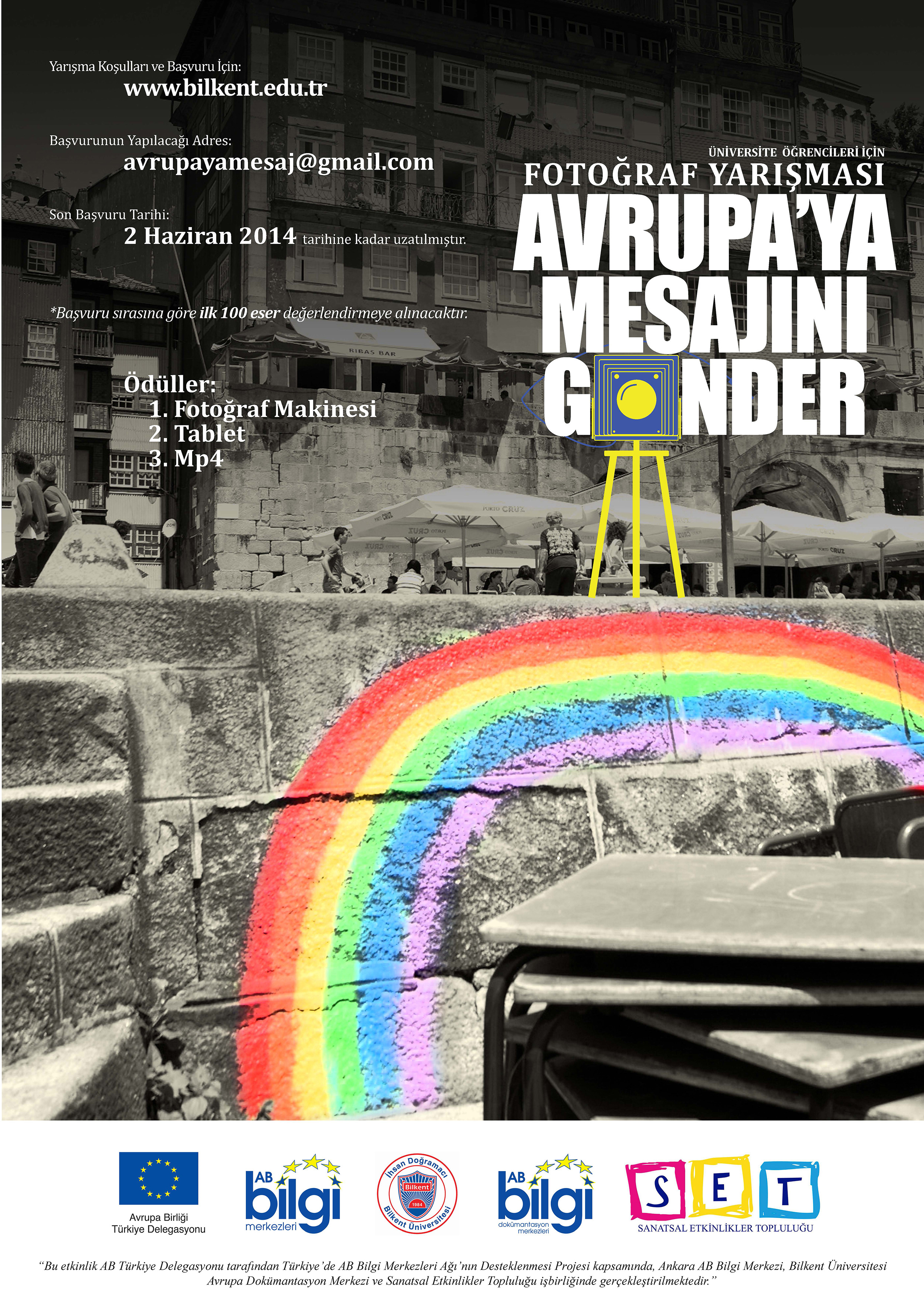 Ankara AB Bilgi Merkezi, Bilkent Üniversitesi Avrupa Dokümantasyon Merkezi ve Sanatsal Etkinlikler Topluluğu İşbirliğinde düzenlenen Fotoğraf Yarışması, Ankara’da yaşayan üniversite gençliğinin Avrupa, Avrupalılık ve Avrupa Birliği gibi temalarda düşünmelerini; Avrupa’ya iletmek istedikleri mesajları yaratıcı ve estetik bir şekilde fotoğraf aracılığıyla kurgulamaları ve fotoğrafın bir iletişim aracı olarak kullanılabilmesinin sağlanmasını amaçlamaktadır. Yarışma Ankara’daki üniversitelerin lisans, yüksek lisans ve doktora öğrencilerine açık olup, 2 Haziran 2014 Saat 17:00’e kadar başvuru alacaktır.